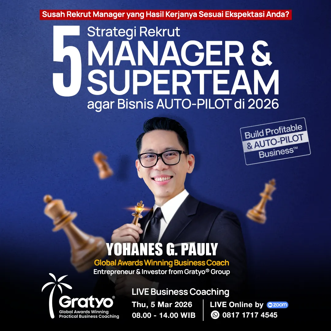 Kami di Gratyo® Practical Business Coaching yang dipimpin oleh Coach Yohanes G. Pauly yang dikenal sebagai Global Awards Winning Business Coach. Membantu para Pemilik Bisnis dan calon Entrepreneurs untuk membangun Bisnis menjadi semakin Profitable & AUTO-PILOT.